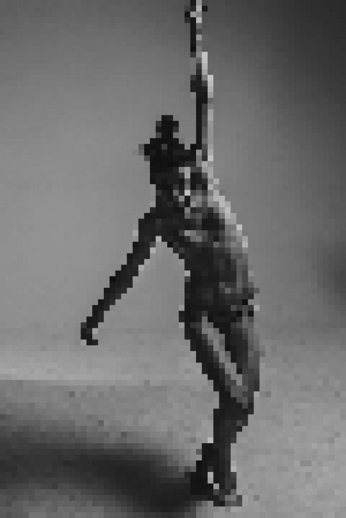 A final male solo abounds in singular incidents: In one fast step, Craig Wasserman arches sideways like a bow while extending one leg like its arrow. He ends both solo and ballet with a slow, marvelous and extraordinary gesture: Standing upright, he first holds his hands together high above his head, but then very slowly peels one hand down — down in a vertical line, down the other arm, down across his chest, down past his hip. As that hand and arm descend, they pull his upper body off-center, so that he seems to be hanging like a puppet from that one, still-raised hand; he seems also to have opened his heart to us.